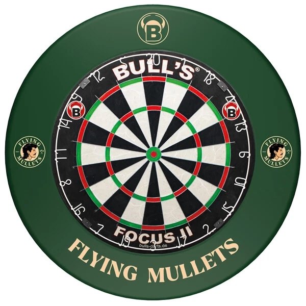 Focus II dartskive kombineret med en unik Flying Mullet beskyttelsesring.