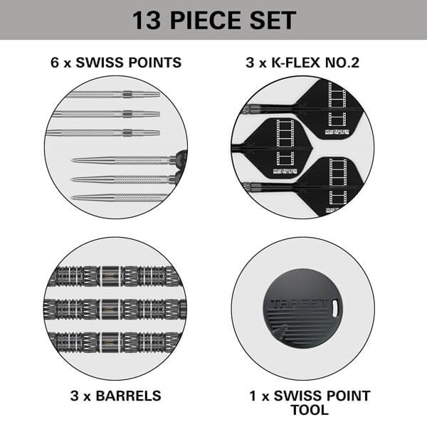 Sættet leveres med Swiss GRD Points i både 30 mm og 35 mm, så spilleren kan tilpasse opsætningen efter sin kastestil.