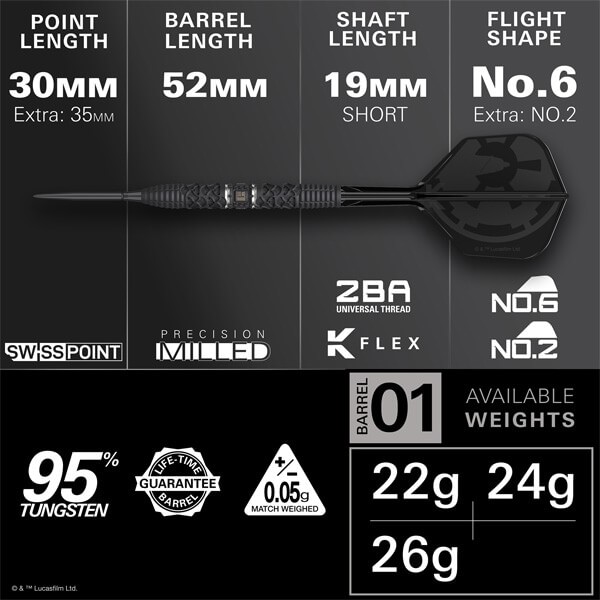 De 95% tungsten barrels er præcisionsfræset med detaljerede Darth Vader-graveringer og en sort PVD-coating, der giver et overlegent greb, ekstra holdbarhed og en dramatisk, mørk finish. Balancen er nøje afstemt for maksimal kontrol, hvilket gør pilene lige dele kunst og ingeniørarbejde.