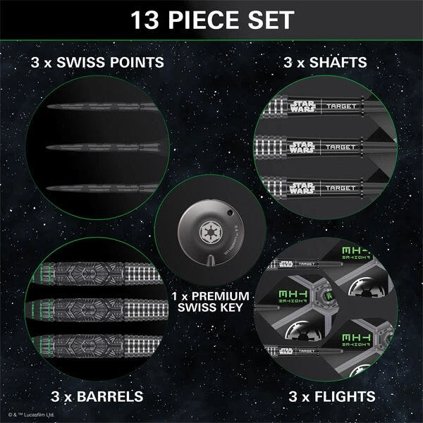 Pilene er udstyret med Onyx Swiss Storm Points og Targets patenterede Swiss Point-teknologi, som giver et sikkert greb i dartskiven og et strømlinet, aerodynamisk fit. Den matte sorte coating afspejler TIE Fighterens stealth-look, og med det medfølgende Swiss Point-værktøj kan spidserne udskiftes hurtigt og nemt.