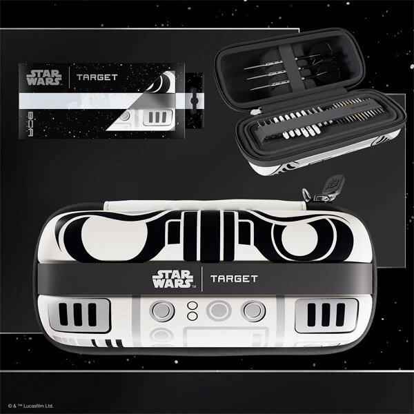 Med sin klassiske hvide rustning og markante sorte detaljer fanger walleten Stormtrooperens genkendelige udtryk og bringer Star Wars™-universet direkte til dartbanen. Indvendigt får du plads til 6 fuldt samlede dartpile, et traysystem til 12 shafts og 15 Swiss Point-spidser – den eneste dart-wallet i galaksen med dedikeret Swiss Point-opbevaring!