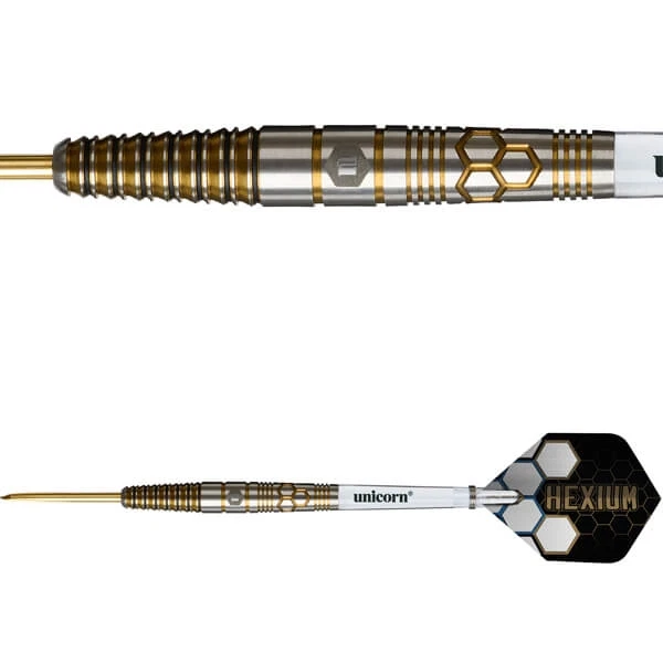 Det præcisionsfræsede Hexium-greb, placeret mellem tydelige snit, giver fast greb og jævne afkast. Den naturlige tungstenfinish står i flot kontrast til den gyldne PVD-belægning, som giver et markant og modigt udtryk på oche’en.