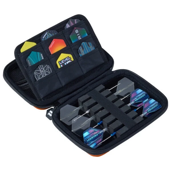 Etuiet har plads til to komplette sæt samlede dartpile, 9 flight-lommer, 18 skaft-holdere og et praktisk lynlåsrum til ekstra tilbehør.